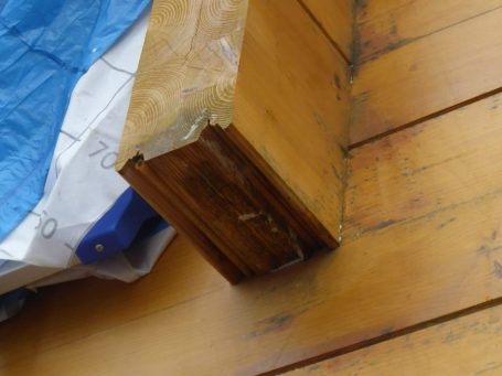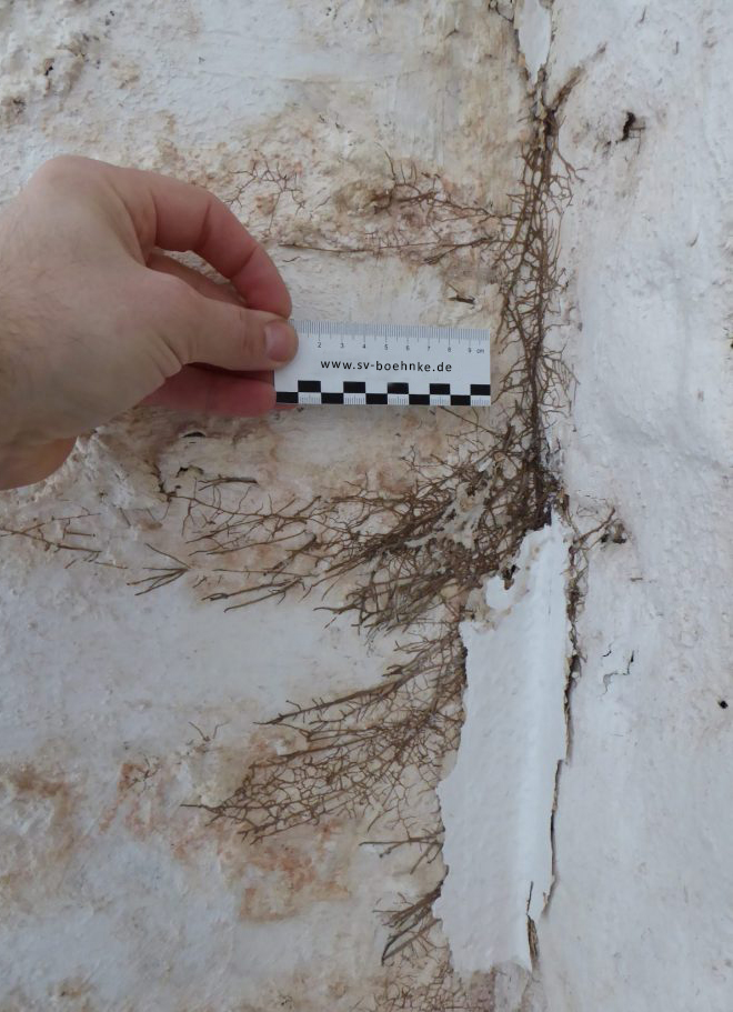 Manchmal kann ich die Kunden auch beruhigen: Bei dem Bild rechts, handelte es sich nicht um einen holzzerstörenden Pilz, wie von den Eigentümern befürchtet, sondern um die Wurzeln von Efeu, welches früher einmal auf der Fassade gewachsen war und dessen Wurzeln durch Risse im Mauerwerk, nach innen gewachsen sind.